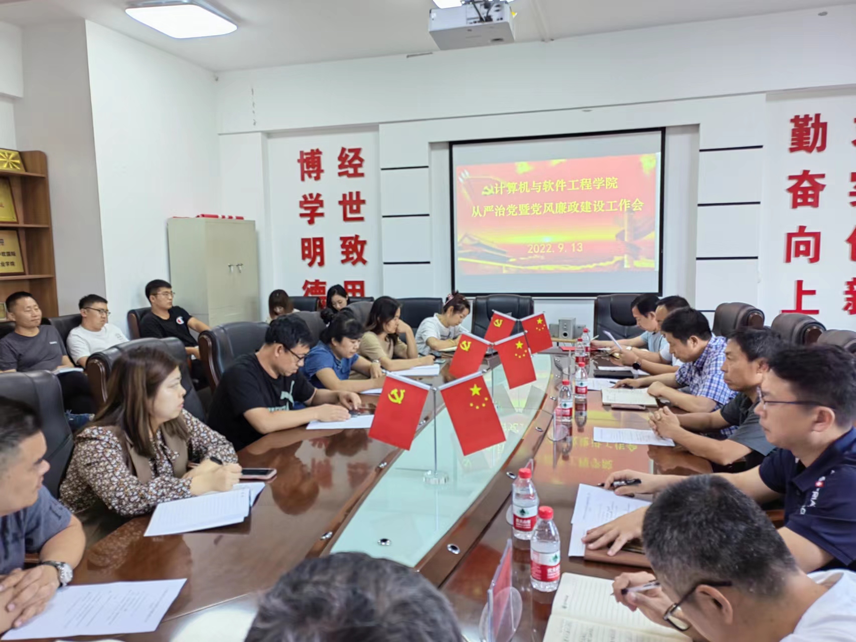 2022年9月13日下午,计算机学院从严治党暨党风廉政建设工作会在博识楼B327召开,学院领导班子成员、科级以上干部、系(中心)主任、党支部书记参加会议,会议由院长赵骥主持。